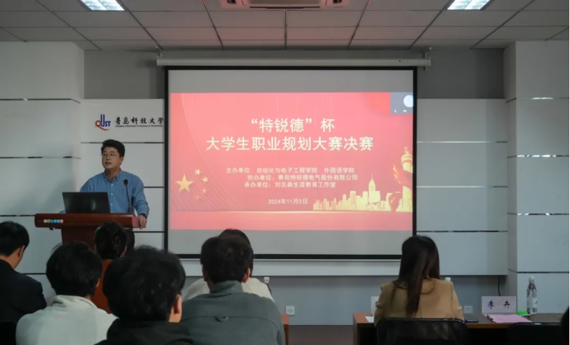 为促动学院高质量充分就业,赋能学子职业发展,11月5日下午,“特锐德”杯大学生职业规划大赛决赛在自动化与电子工程学院410会议室举办。特锐德电气股份有限公司人力资源中心总经理韩增雪,软控股份有限公司招聘经理张爱华,凤凰网青岛文旅事业部总经理、KA客户总监张欣欣,崂山区融媒体中心新闻部副主任康船海,自动化与电子工程学院党委书记李卉,学生处副处长兼就业指导中心主任徐华,外国语学院党委副书记兼副院长马寒,自动化与电子工程学院党委副书记兼副院长刘名森出席活动,自动化与电子工程学院、外国语学院辅导员及学生代表参加活动,活动由自动化与电子工程学院团委副书记兼学工办副主任张郁浩主持。